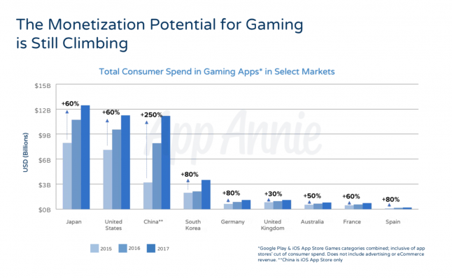 That figure comes from App Annie’s 2017 Retrospective report, and means China is now the third most valuable mobile games market by a significant margin (in terms of consumer spend).