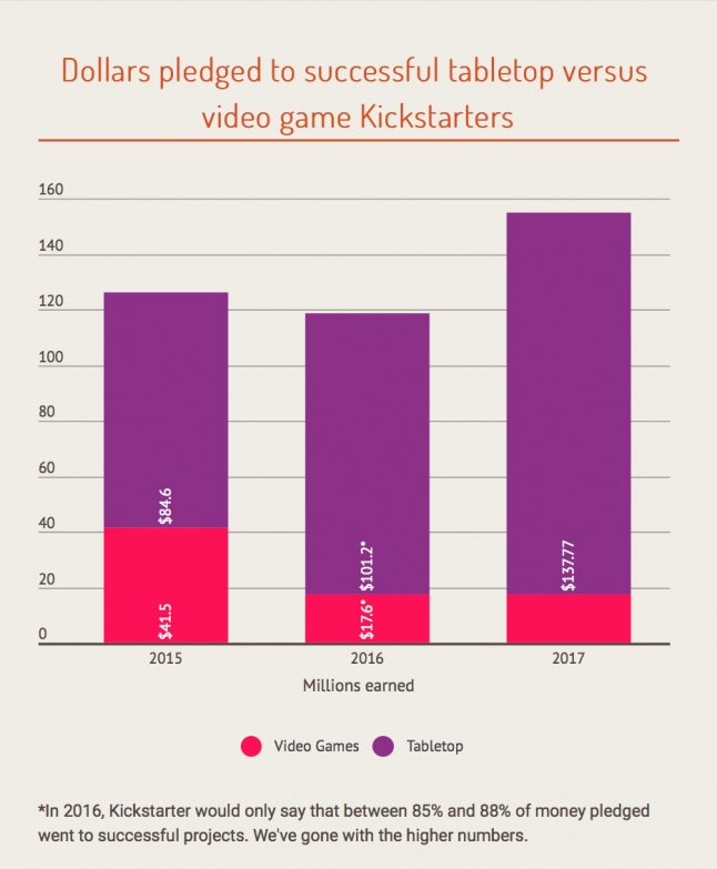 Although there’s some leeway with those numbers given Kickstarter’s reluctance to share exact pledge figures, it’s interesting to note the growing appetite for tabletop games compared with the apparent stagnation of video game campaigns.